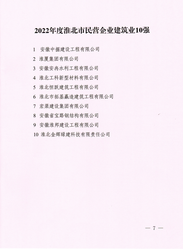 会议发布了民营企业纳税10强、营收10强、建筑业10强,并对上榜企业进行授牌。我会副会长单位安徽中掘建设工程有限公司荣获2022年度淮北市民营企业纳税10强、2022年度淮北市民营企业营收10强,副会长单位宏渠建设集团有限公司、安徽中掘建设工程有限公司、淮厦集团有限公司,常务理事单位淮北恒跃建筑工程有限公司,理事单位安徽安冉水利工程有限公司荣获2022年度淮北市民营企业建筑业10强。