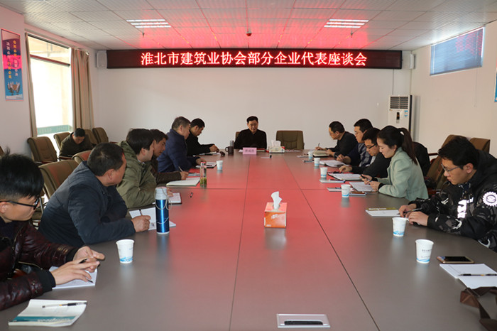 座谈会由市建协秘书长黄士勇主持,淮北矿业(集团)工程建设有限责任公司、淮北市一建工程有限责任公司、淮北市第二建筑安装有限责任公司、淮北市第三建筑安装公司、淮北市拓基赢造建筑工程有限公司、淮北华松建筑安装有限公司、淮北信和水利建筑工程有限公司、安徽相王建设工程有限公司等多家施工企业会员单位人员参加了座谈会。