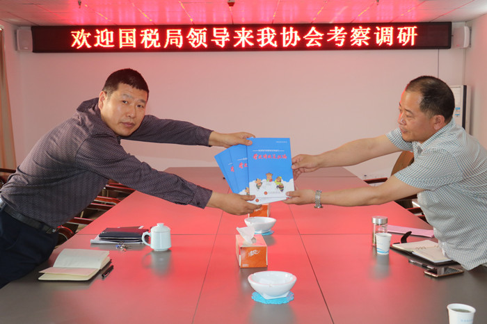 2017年5月16日上午10点,市国税局货劳税科唐怀全科长和吴玉超来我协会调研指导,协会秘书长黄士勇、副秘书长曾祥永和协会秘书处职员参加了调研会。