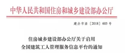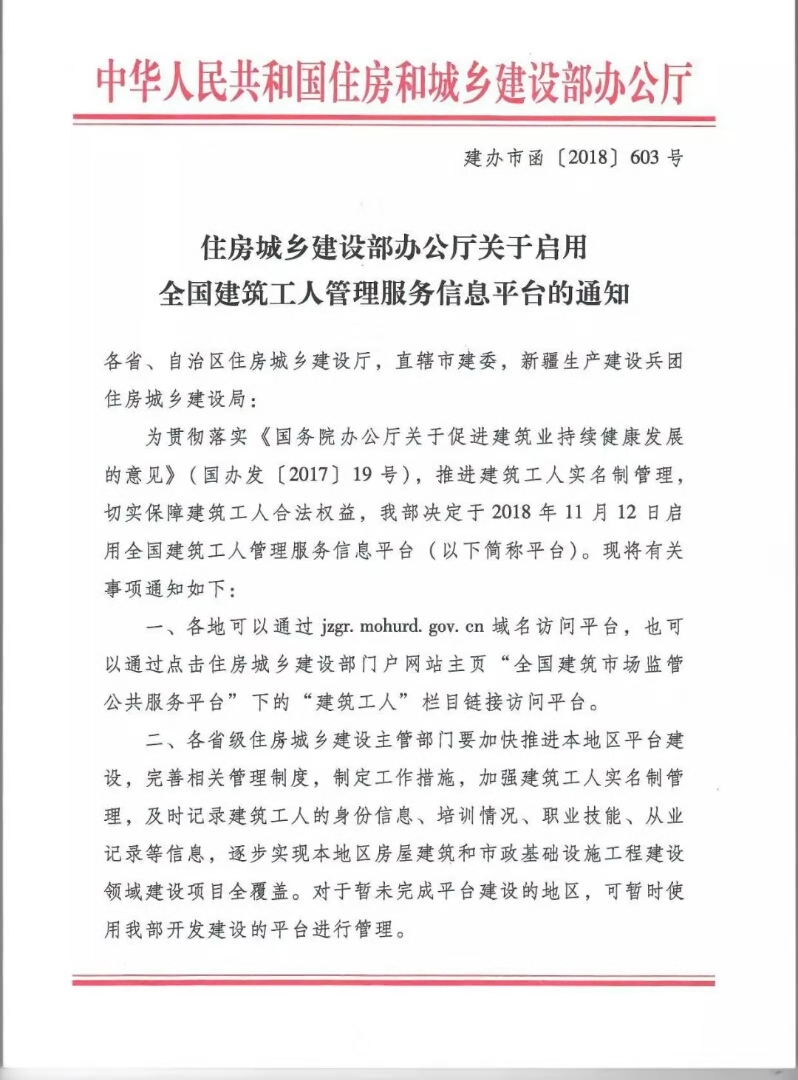 日前,住房城乡建设部办公厅印发《关于启用全国建筑工人管理服务信息平台的通知》(建办市函[2018]603号)。 文件指出,为贯彻落实《关于促进建筑业持续健康发展的意见》(国办发〔2017〕19号)有关要求,推进建筑工人实名制管理,切实保障工人合法权益,住建部定于2018年11月12日启用全国建筑工人管理服务信息平台。