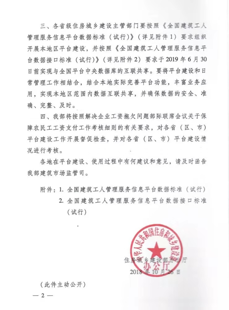 《全国建筑工人管理服务信息平台数据标准(试行)》、《全国建筑工人管理服务信息平台数据接口标准(试行)》也以附件形式印发。