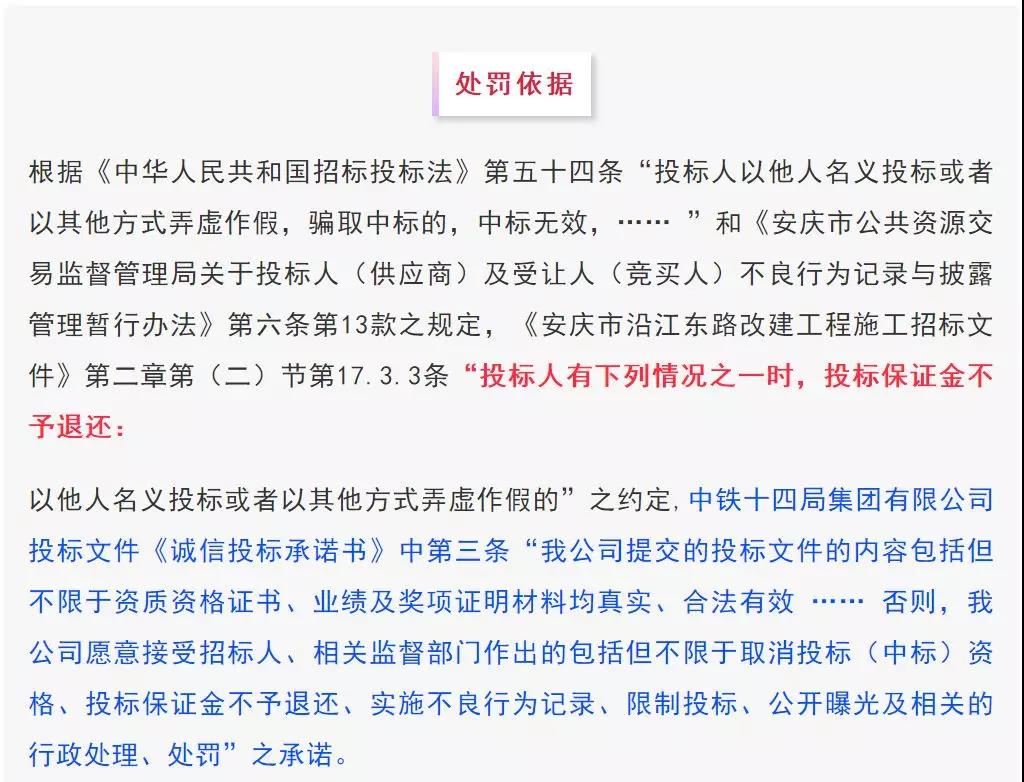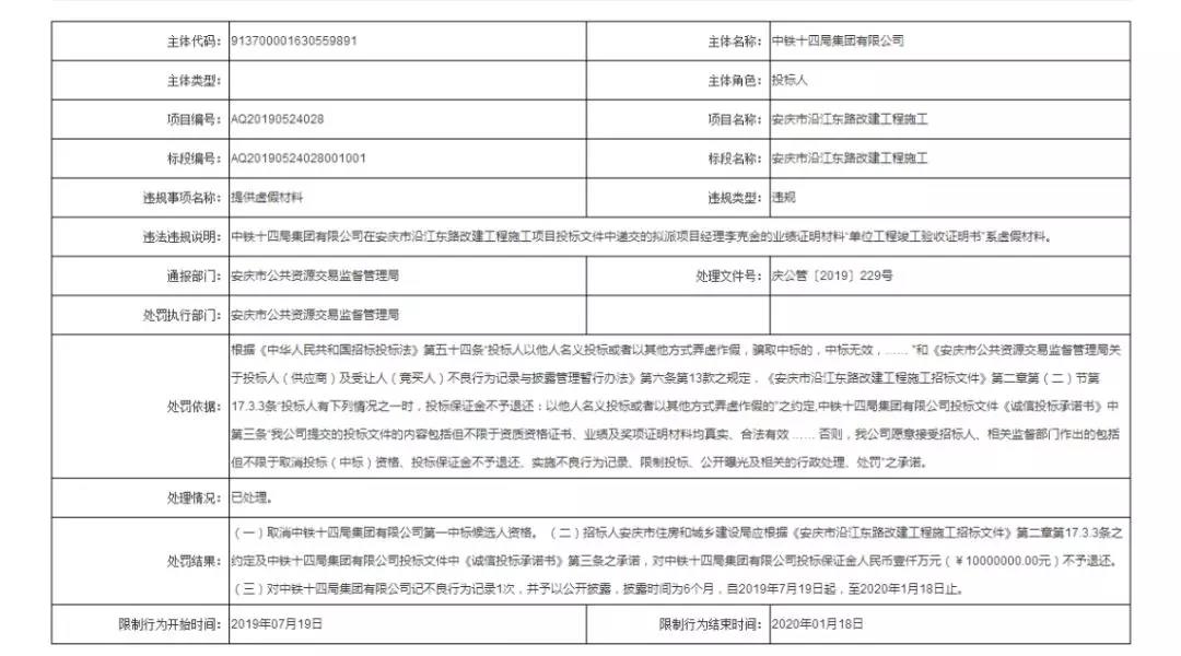 1、违规说明:中铁十四局集团有限公司的投标文件中,拟派项目经理的业绩证明材料“单位工程竣工验收证明书”系虚假材料。