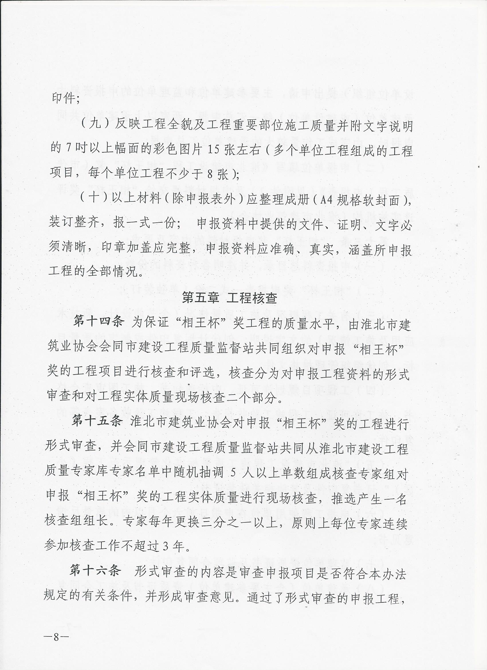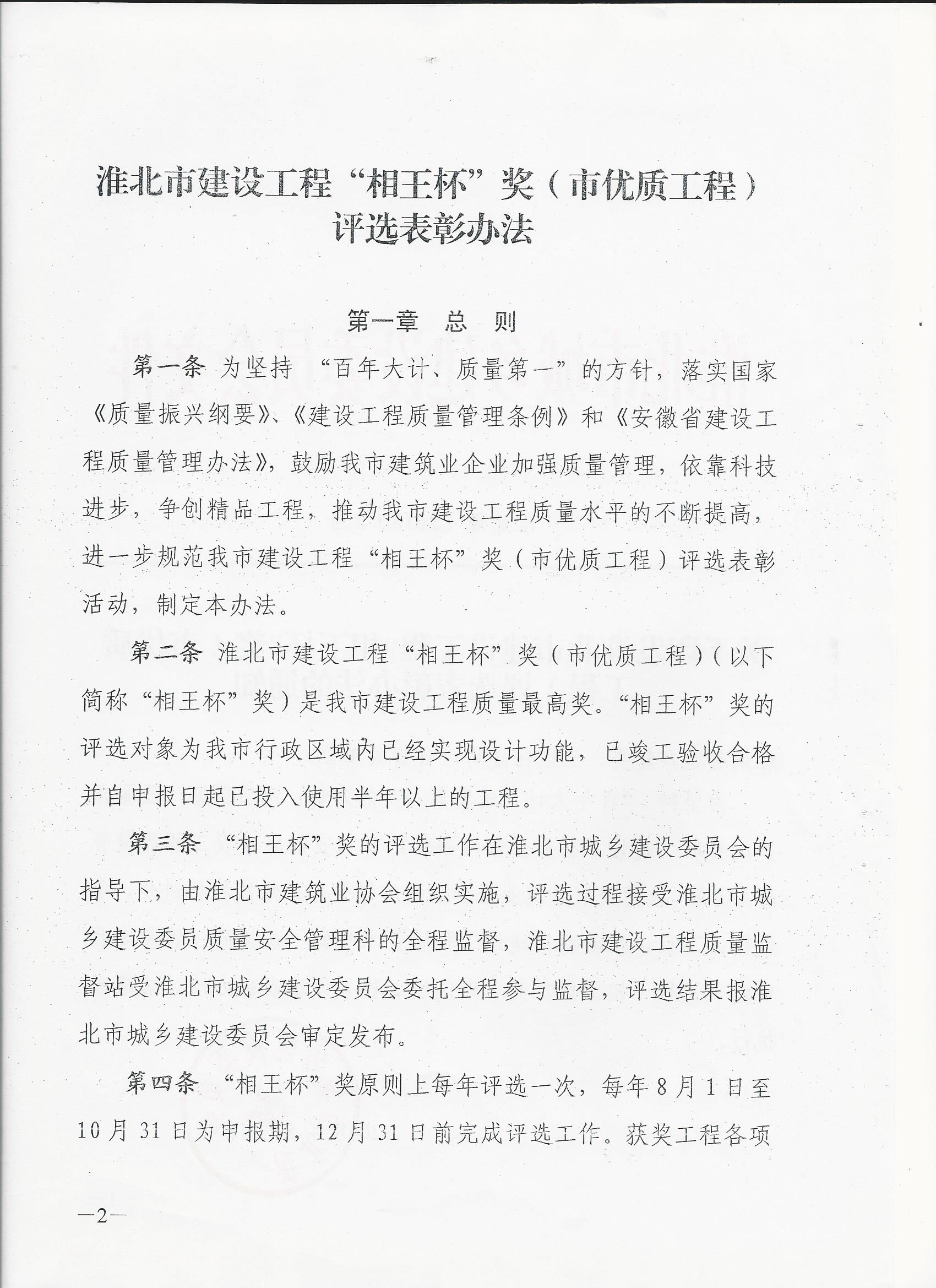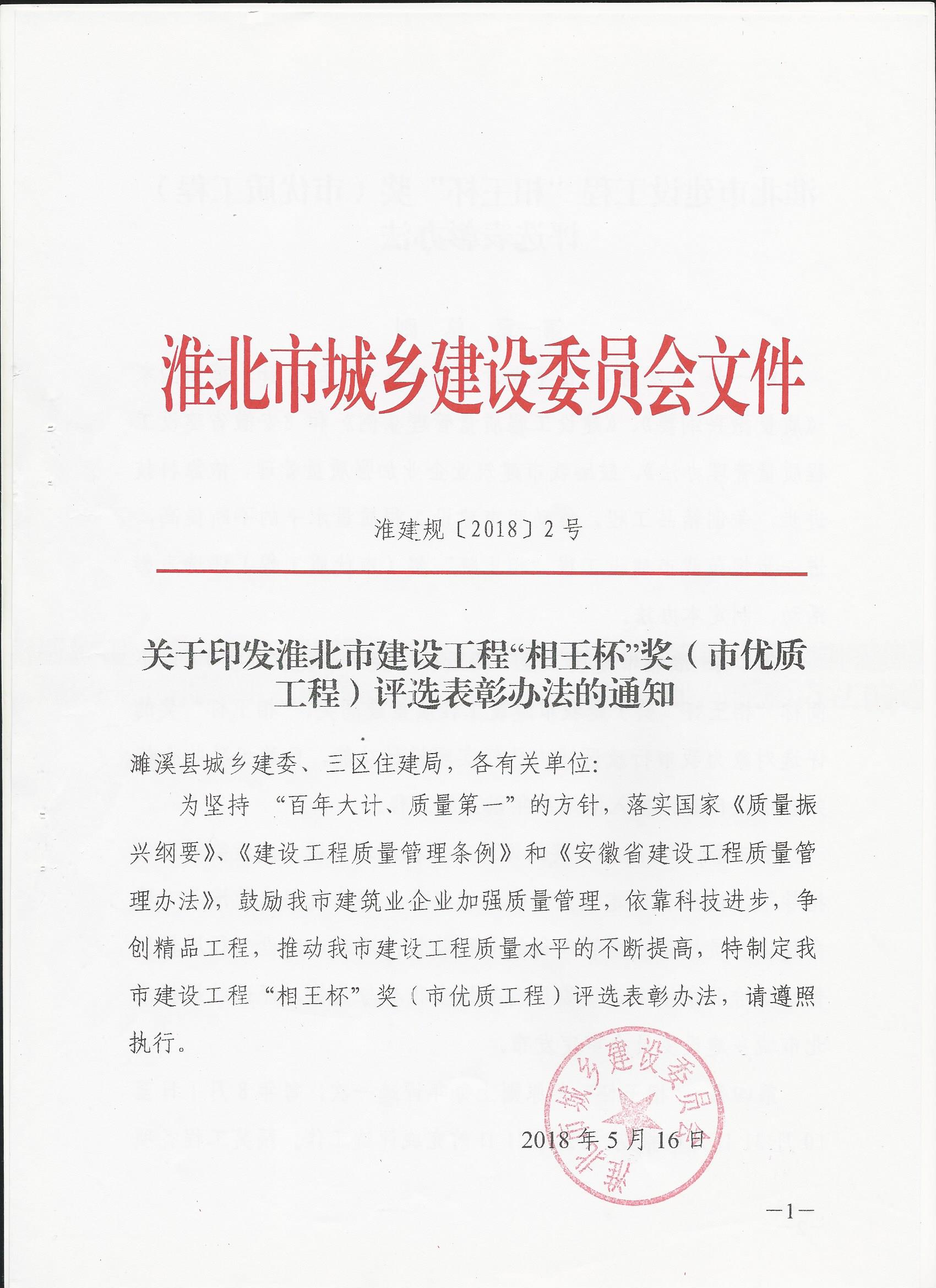 2018年淮北市建设工程“相王杯”奖(市优质工程)评选申报工作已开始,请有意愿申报的单位按照《淮北市建设工程“相王杯”奖(市优质工程)评选表彰办法》的要求在2019年4月10日之前将申报材料装订成册报至我协会。