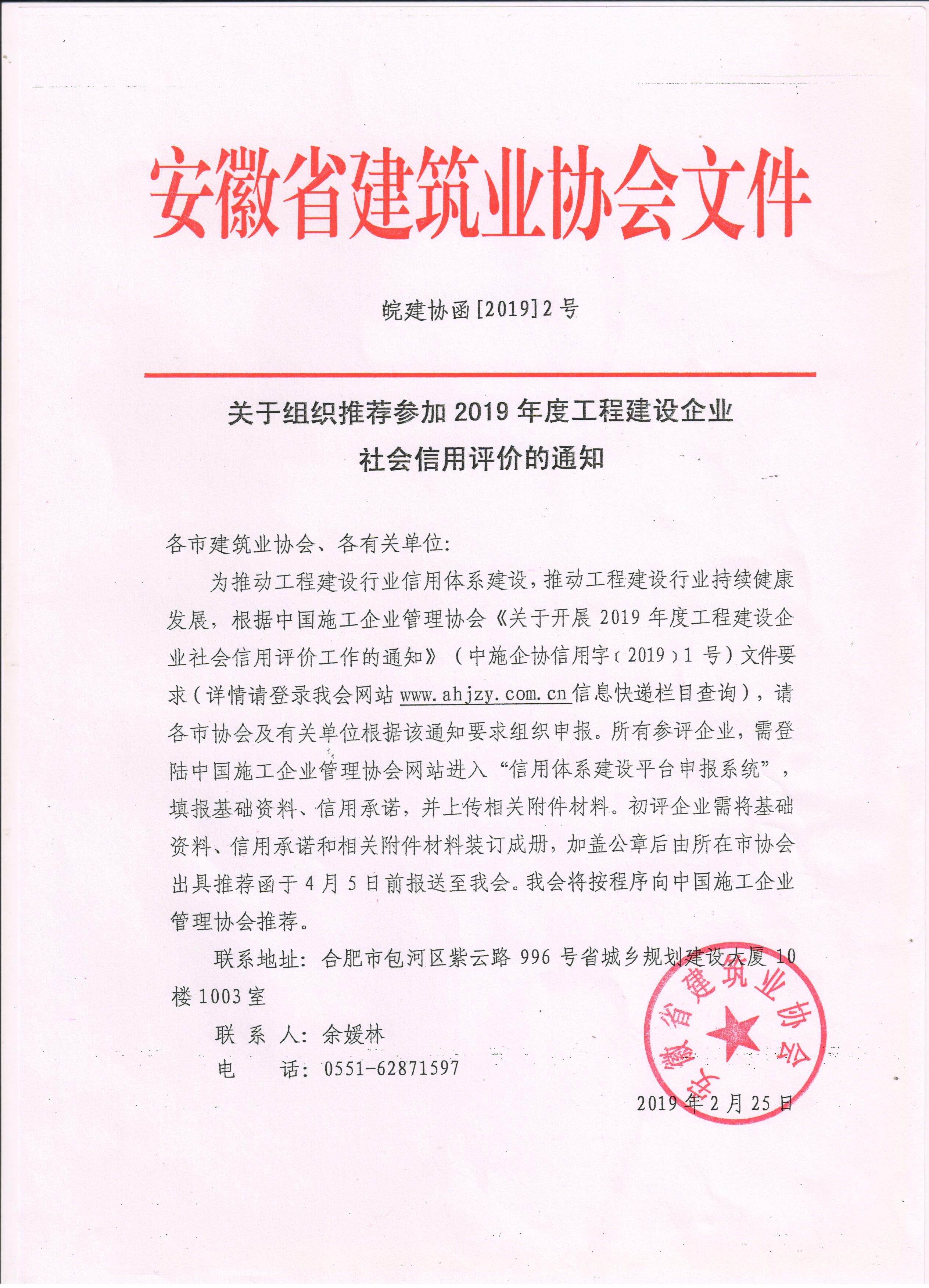 省建筑业协会将《关于组织推荐参加2019年工程建设企业社会信用评价的通知》(皖建协函〔2019〕2号)发至我协会,企业社会信用评价对推动工程建设行业信用体系建设有着重要的意义,请各施工企业会员单位按照自身情况准备相关材料,并于3月29日之前将材料报至协会。