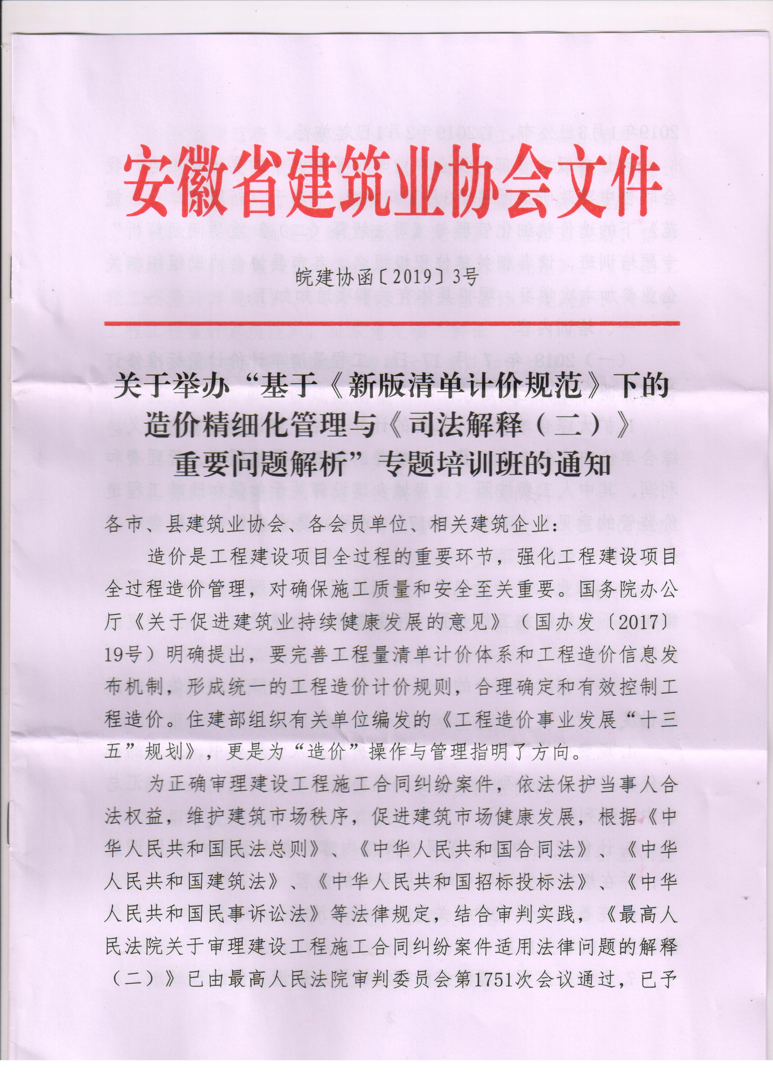 现我协会收到了省建筑业协会文件《关于举办“给予<新版清单计价规范>下的造价精细化管理与<司法解释(二)>重要问题解析”专题培训班的通知》(皖建协函〔2019〕3号),请各会员单位按照本通知的要求,结合企业自身的情况组织人员参加此培训班。