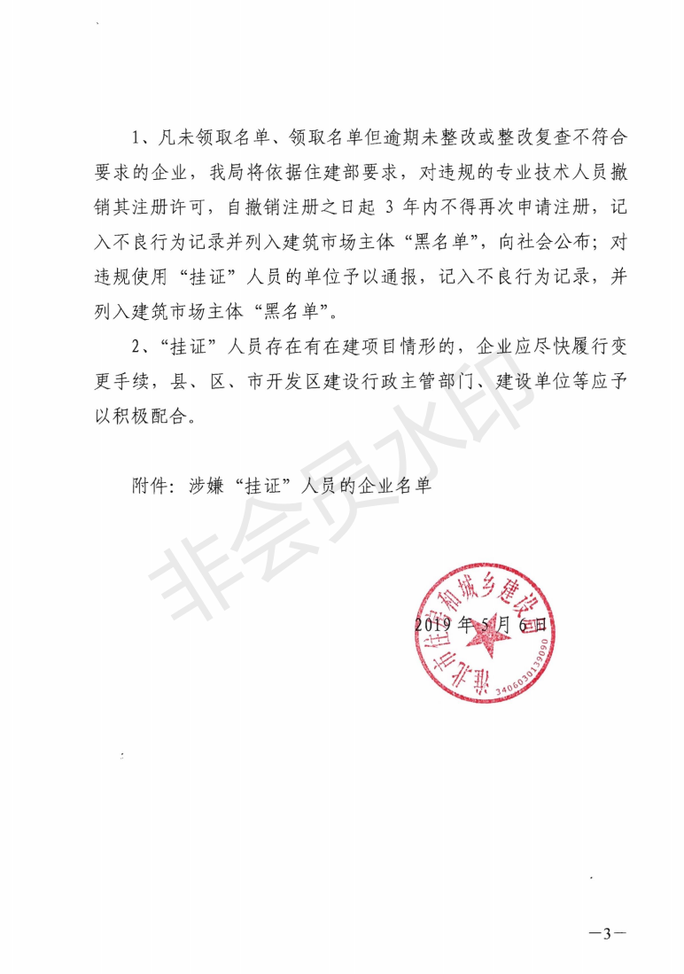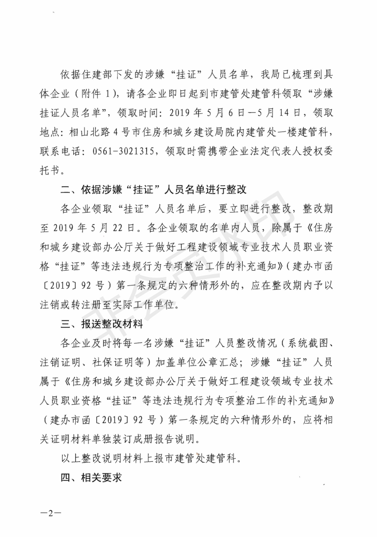 现我协会收到市建管处发来的《关于进一步做好淮北市工程建设领域专业技术人员职业资格“挂证”等违法违规行为整改工作的通知》(淮住建〔2019〕89号),请该文件附件名单中的相关单位在2019年5月6日—2019年5月14日到市建管处建管科领取“涉嫌挂证人员名单”,并按照通知的要求做好整改工作。
