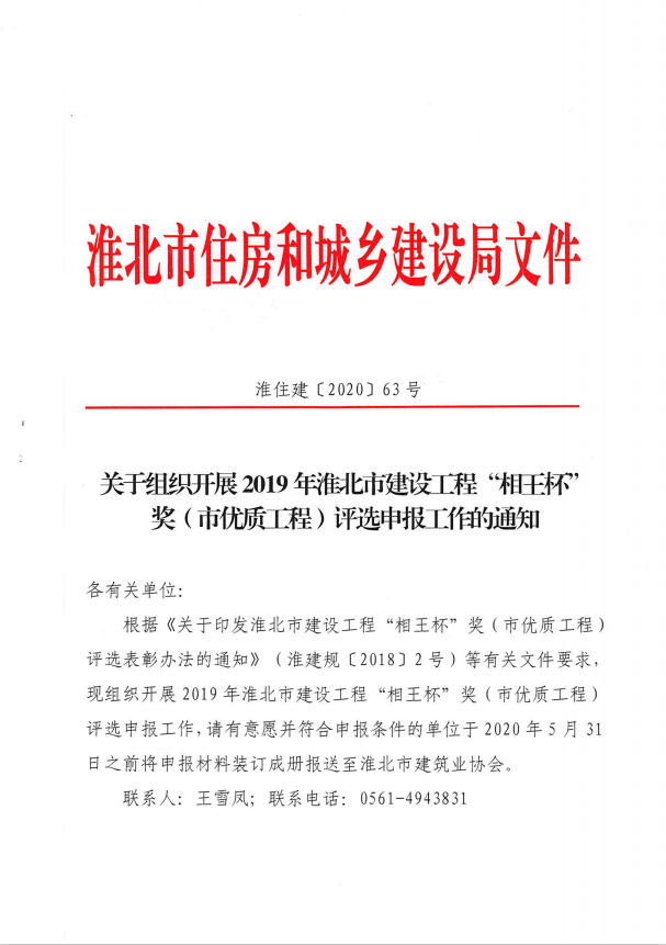 关于组织开展2019年淮北市建设工程“相王杯”奖(市优质工程)评选申报工作的通知