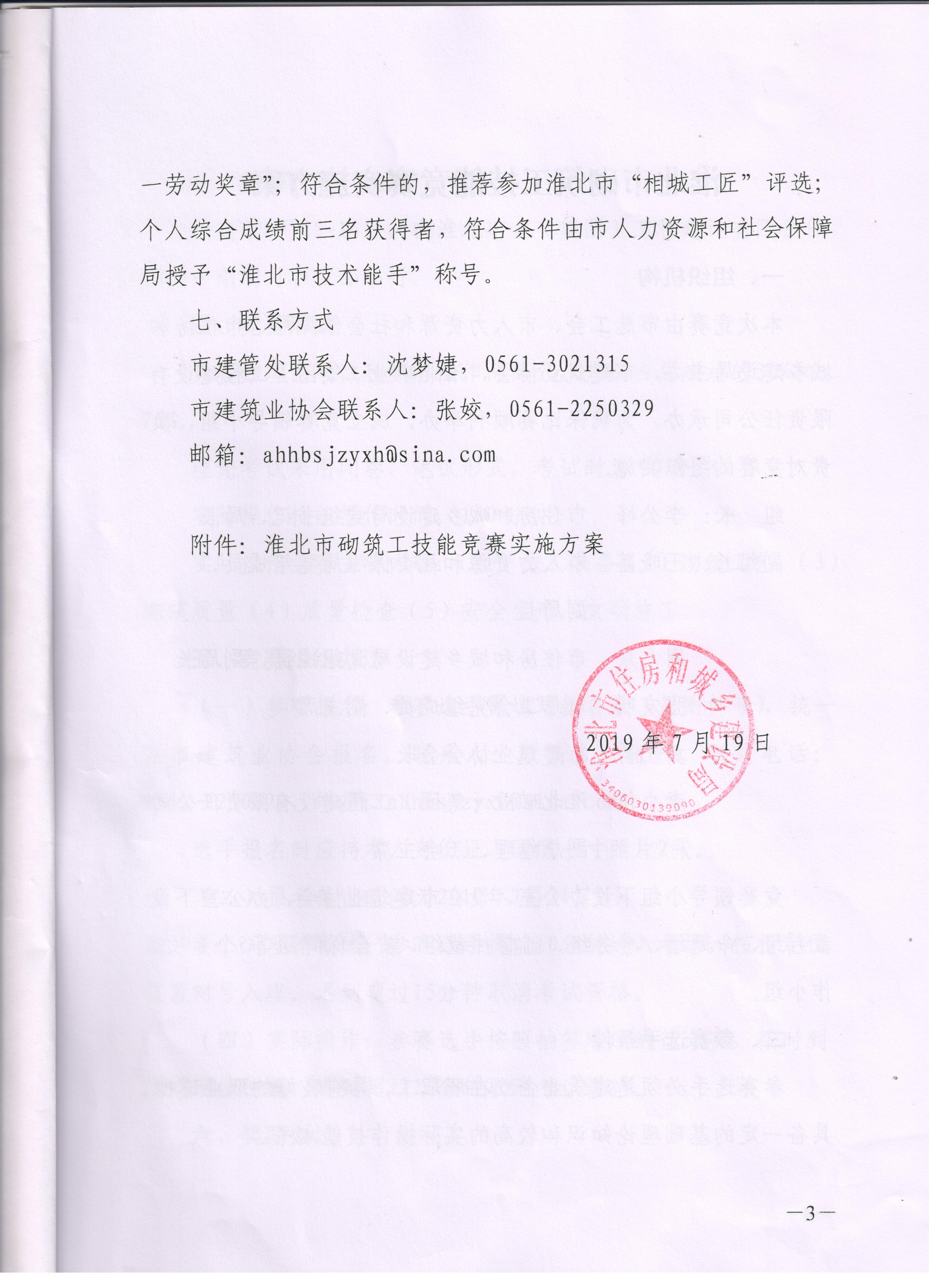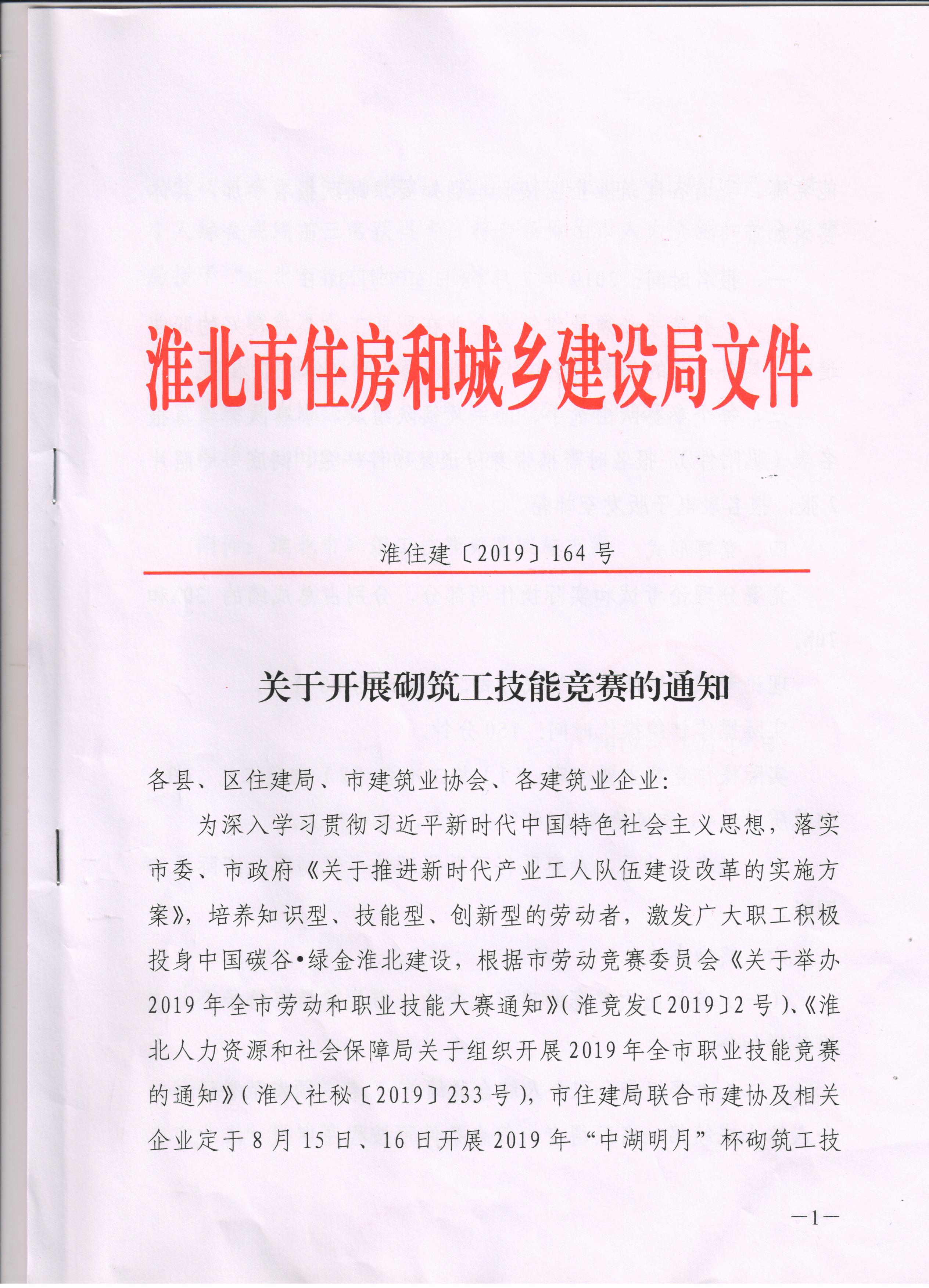 现住建局定于8月15日、16日开展2019年“中湖明月”杯砌筑工技能竞赛,此竞赛对培养技能型人才、激发职工活力有着重要的作用,请各会员单位按照市住建局文件《关于开展砌筑工技能竞赛的通知》(淮建住〔2019〕164号)的要求,积极组织报名工作。相关技能竞赛通知也可通过市住建局网站上进行查询。