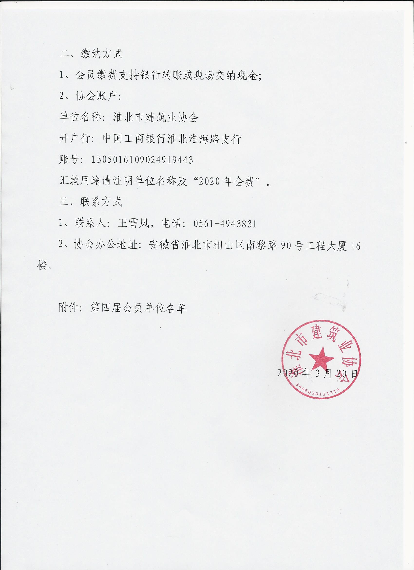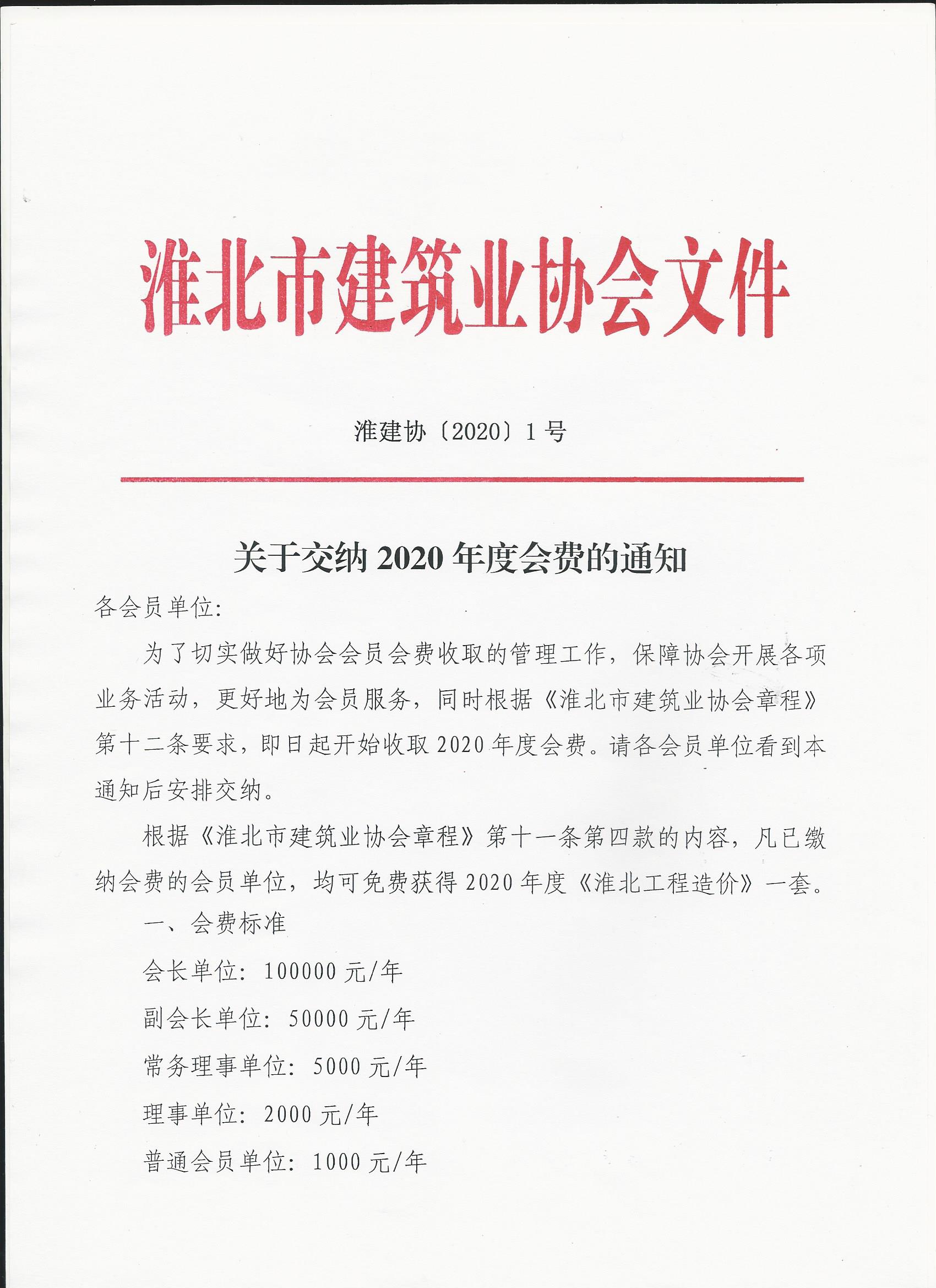 为了切实做好协会会员会费收取的管理工作,保障协会开展各项业务活动,更好地为会员服务,同时根据《淮北市建筑业协会章程》第十二条要求,即日起开始收取2020年度会费。请各会员单位看到本通知后安排交纳。