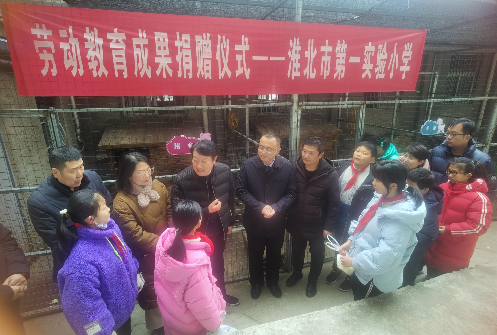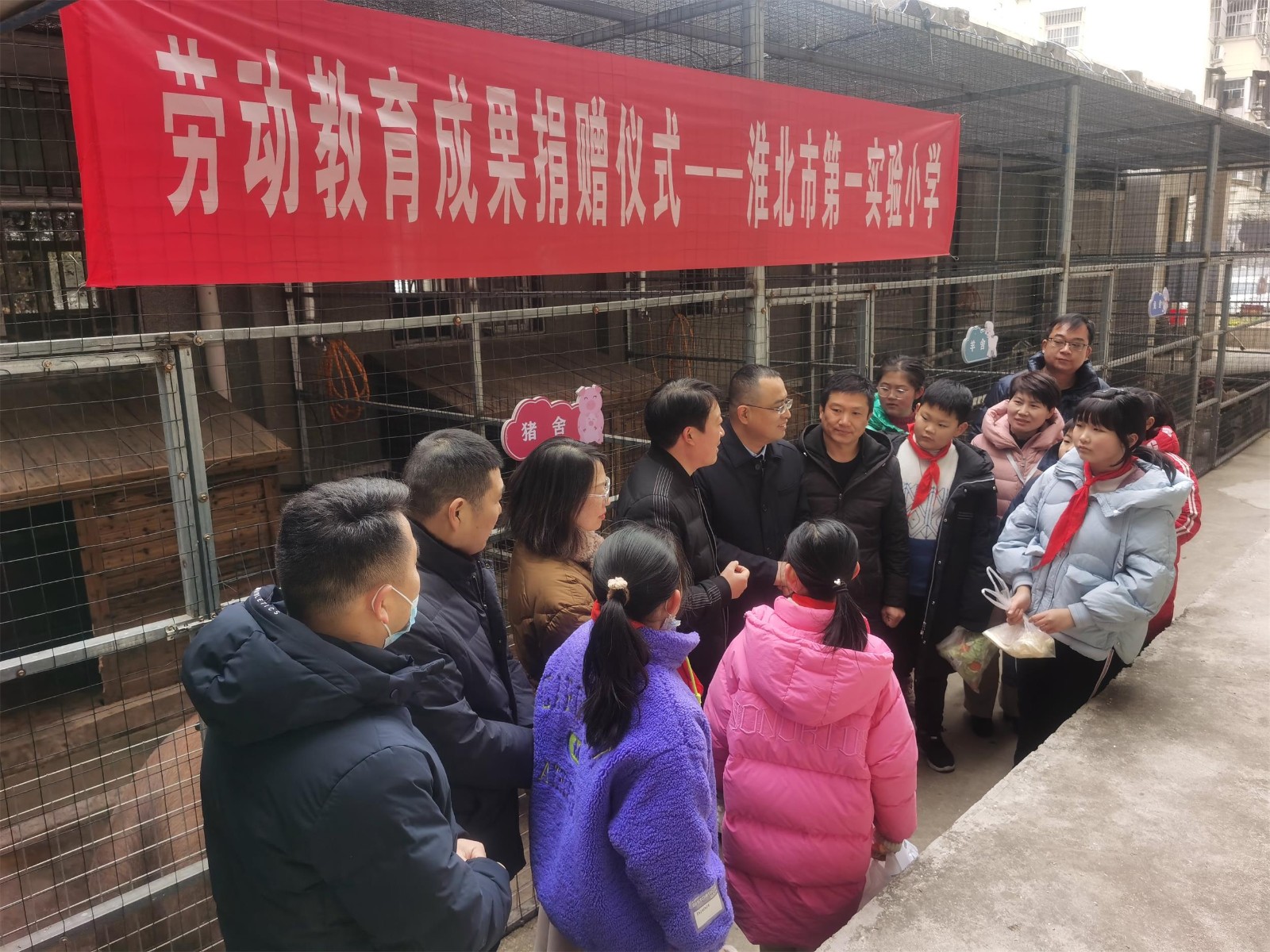 2022年1月14日上午,淮北市实验一小劳动基地,彩旗飘扬,人头躜动,笑声不断,小学生们利用课余时间饲养的两头肥猪正在掌声中被装上汽车——这是淮北市建筑业协会、淮北市第一实验小学联合举办的劳动成果捐赠仪式现场。来到捐赠交接现场的有市社管局局长霍士启、市第一实验小学的老师、学生以及市建筑业协会秘书长黄士勇。