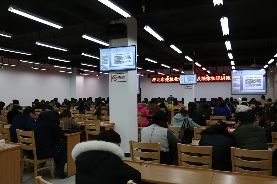 2016年1月15日上午 ,淮北市建筑业协会在淮北市建筑业协会培训中心开展税务及法律知识讲座。讲座主要讲述了营改增税务知识、建设工程施工合同、风险防范及纠纷处理等知识。参会人员均表示学习到了很多实用的知识。