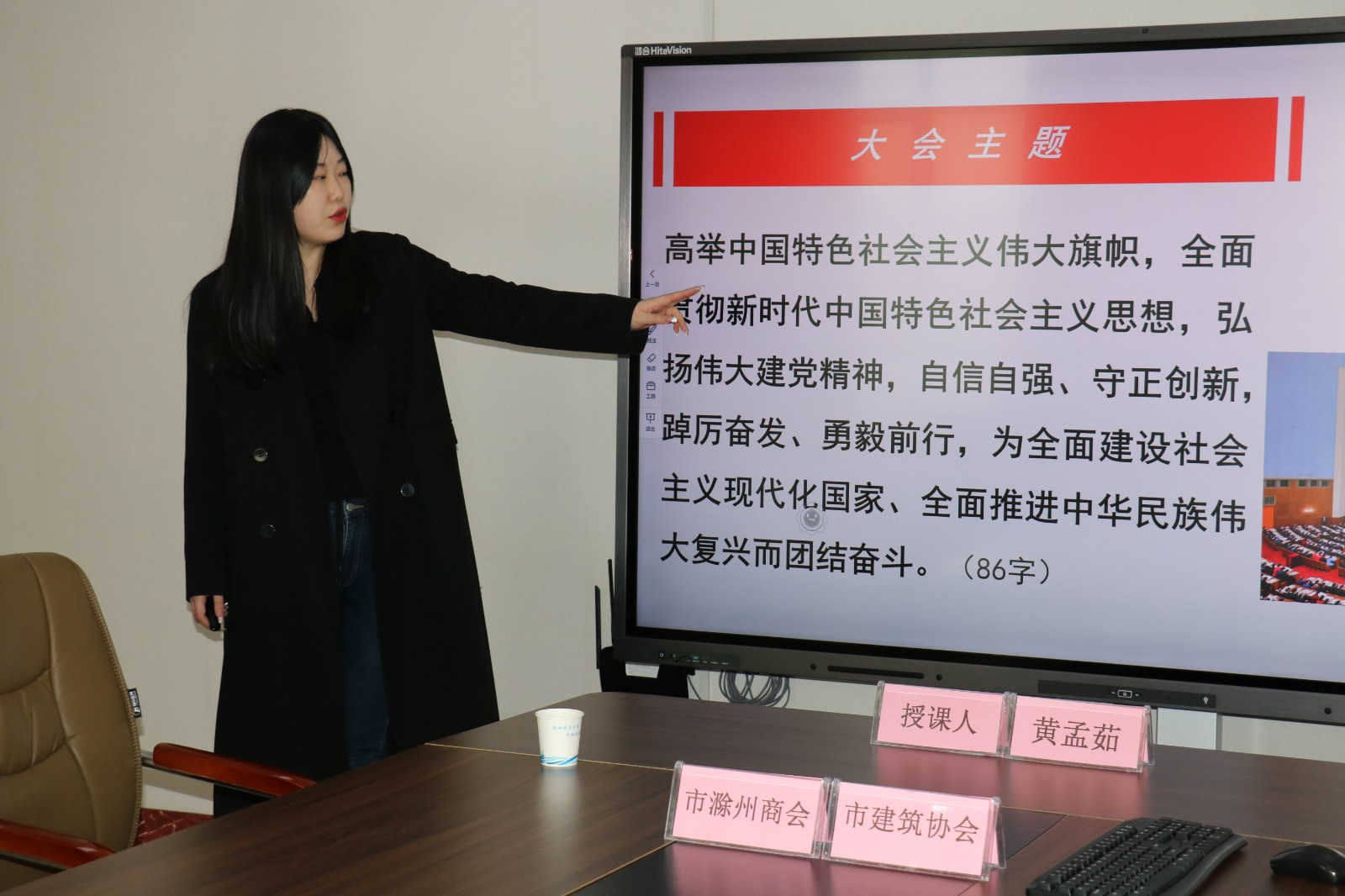 2023年2月2日,淮北市建筑业协会联合淮北市滁州商会召开专题会议,再次学习宣传贯彻党的二十大精神。协会、商会领导班子、协会秘书处全体同志现场参会学习。会议特邀安徽体育运动职业技术学院教师黄孟茹作宣讲报告。协会秘书长黄士勇主持会议。